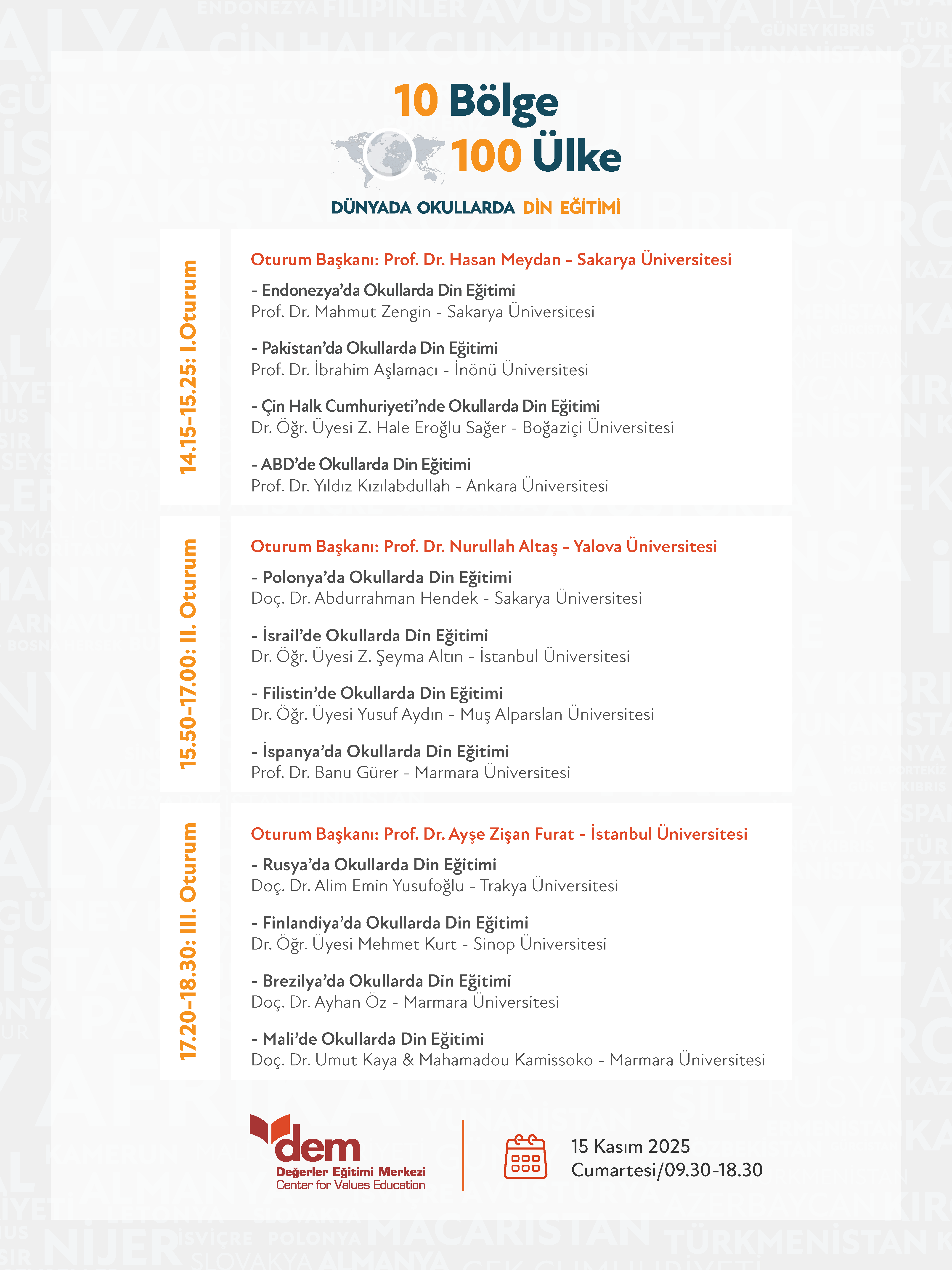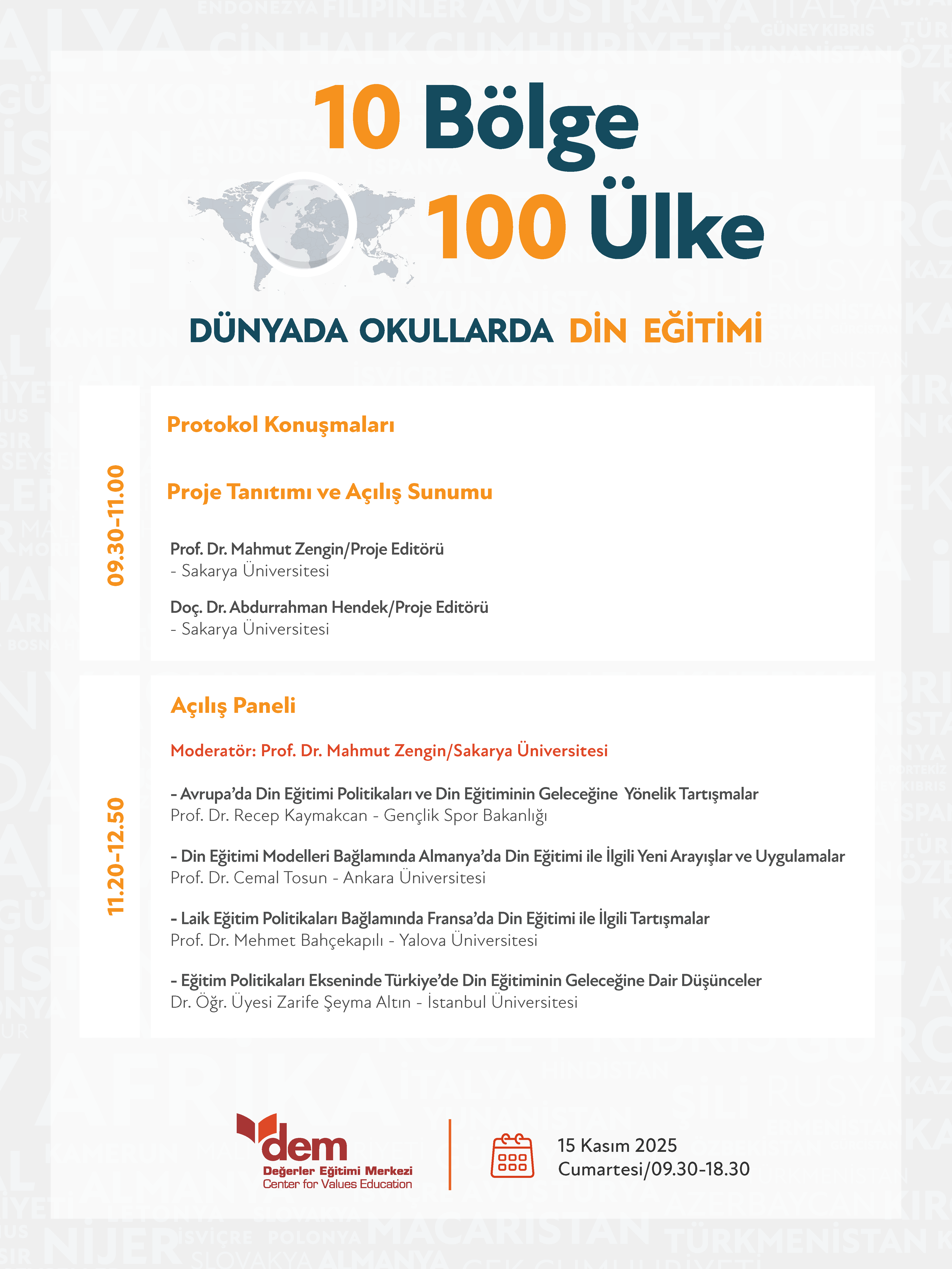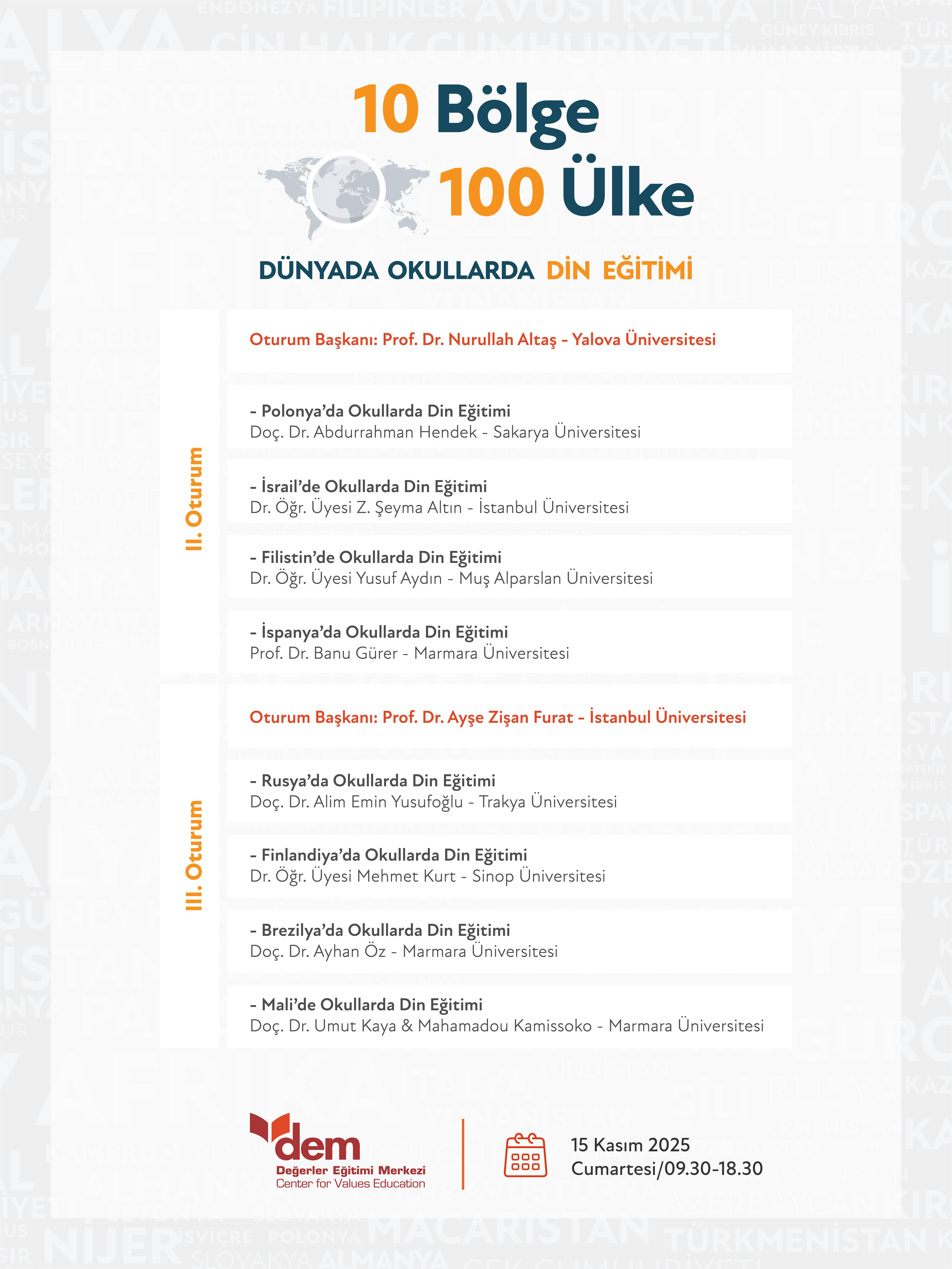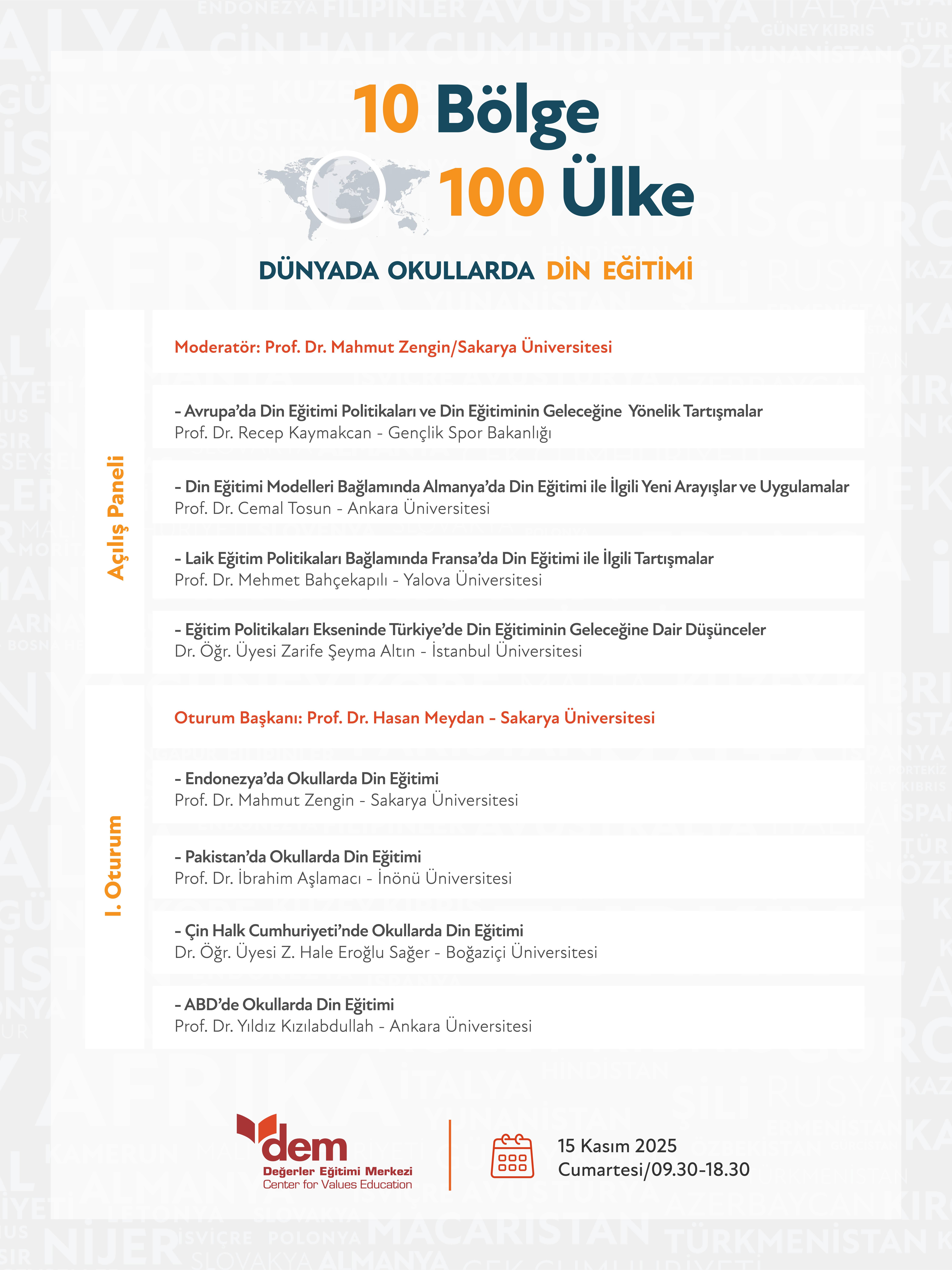 Prof. Dr. Mahmut Zengin ve Doç. Dr. Abdurrahman Hendek editörlüğünde hazırlanan, dünyada farklı ülkelerdeki din eğitimi tecrübelerini bölgesel olarak ortaya koyan ve 10 kitapta 100 ülkenin incelendiği Dünyada Okullarda Din Eğitimi Serisi tamamlandı. Bu çalışmanın sonucunda ortaya çıkan birikimi paylaşmak ve konunun uzmanlarıyla din eğitimi meselelerini ele almak amacıyla 15 Kasım 2025 tarihinde Dünyada Okullarda Din Eğitimi Programı yapılacaktır.
