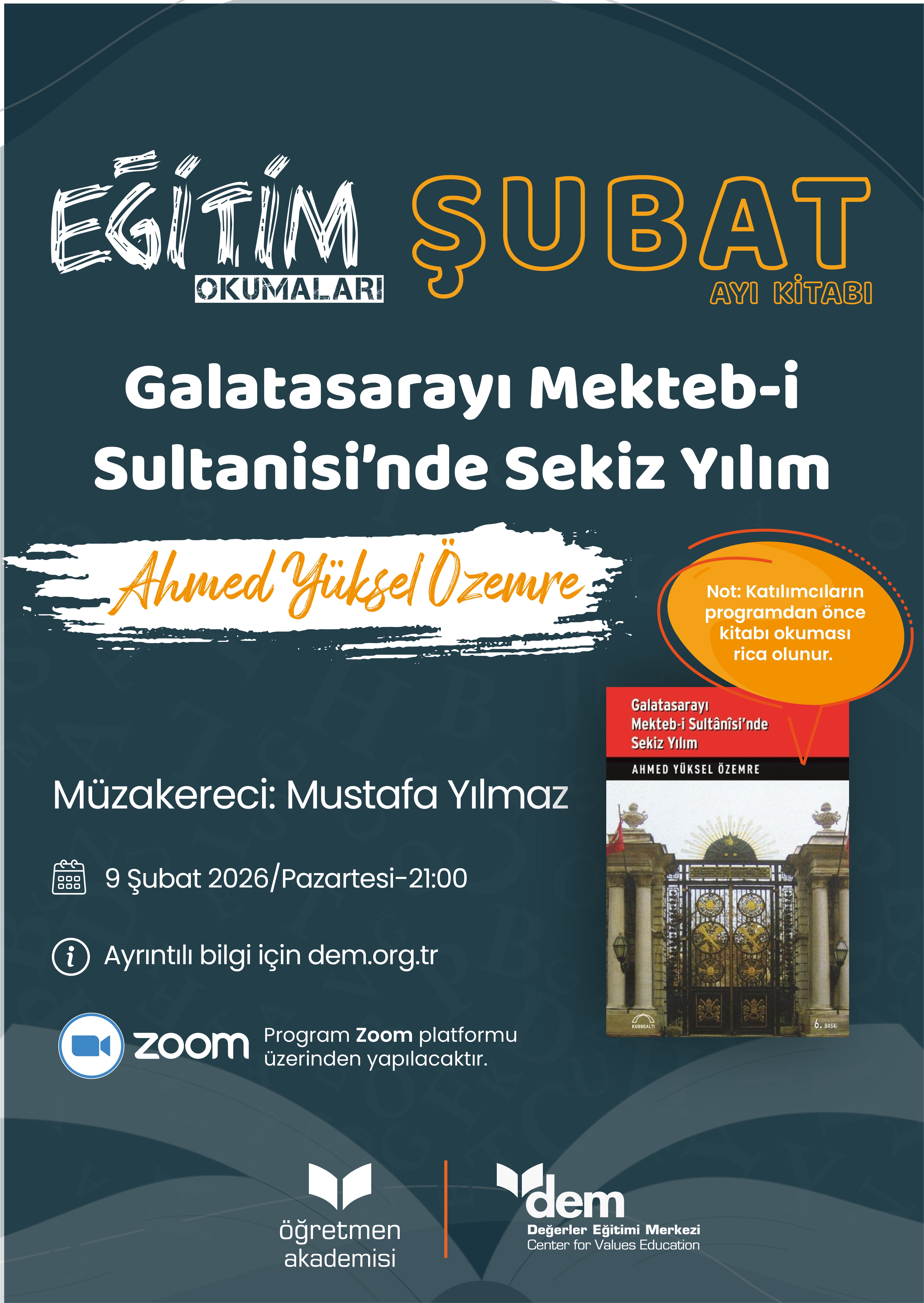 Eğitim Okumaları programının Şubat ayı oturumunda Galatasarayı Mekteb-i Sultanisi’nde Sekiz Yılım (Ahmed Yüksel Özemre) kitabı müzakere edilecektir.